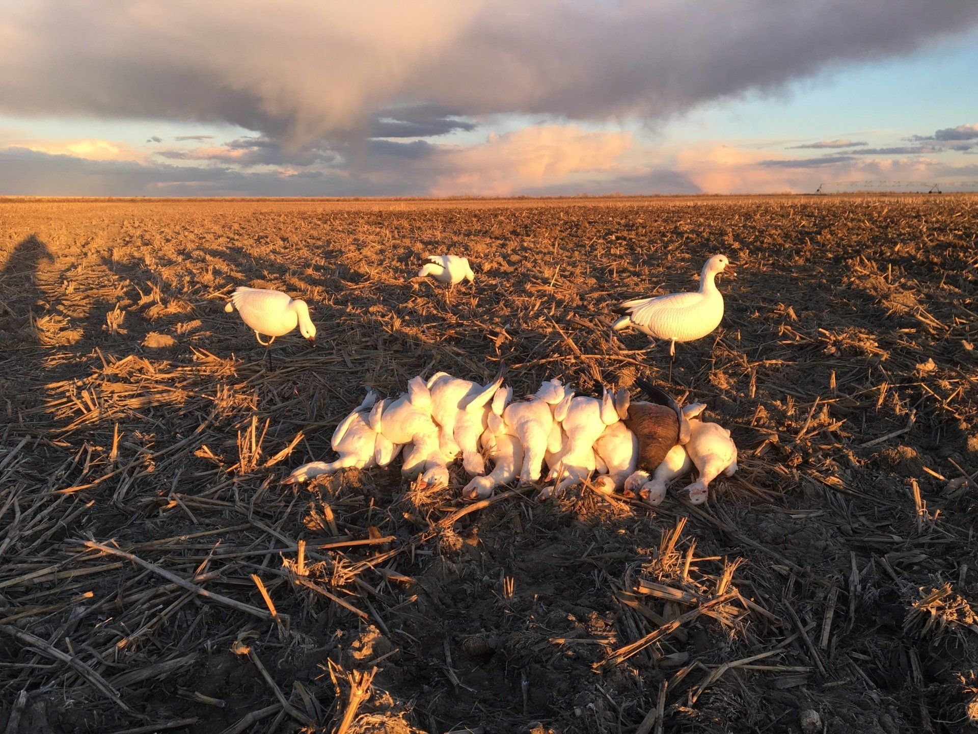 Almost all of our spring snow goose hunting take place in corn stubble fields or pasture ponds. Your snow goose hunting guide will take you to the field where decoys and blinds will already be set and ready to jump in and hunt. We will have an ATV to transport you and your equipment out to the spread. You can expect to hunt from a decoy spread of 500 to 1,500 decoys with a combination of socks and full-body snow goose decoys.